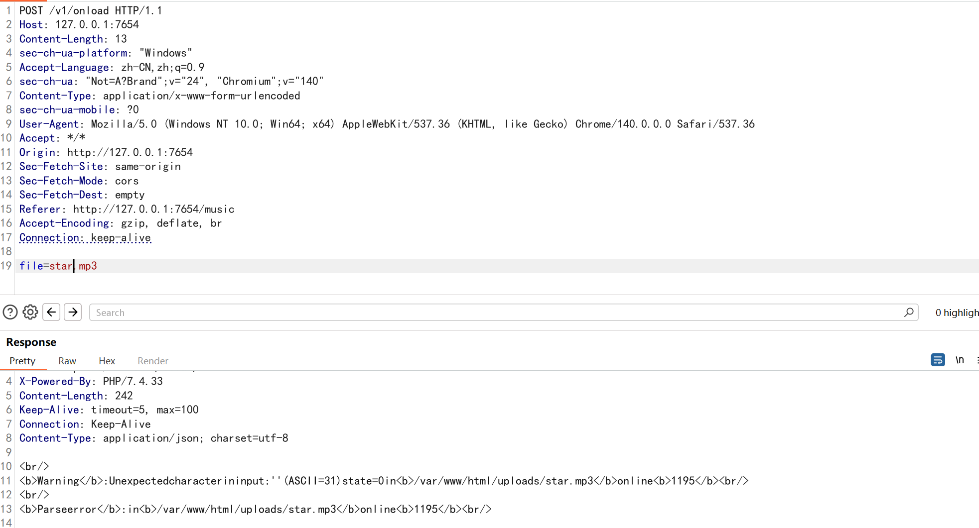deepseek告诉我这个报错是因为服务器试图把 star.mp3 这个 MP3 音频文件当作 PHP 代码来执行,结果在文件里发现了非法字符(MP3 的二进制数据),所以报错